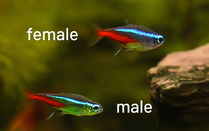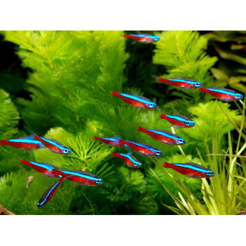 약 20cm 정도의 작은 어항이면 번식용으로 알맞는데 수초는 한 묶음 정도만 필요하다. 번식용 어항에 넣어진 항 쌍의 네온 테트라는 아침이 되어야 산란한다. 암컷은 아주 적은 수의알을 낳으며 약 24시간만에 부화한다. 알을 낳은 부모는 산란 후 어항에서 격리시켜야 한다. 부화 후 4일이 지나면 치어가 헤엄치기 시작하는데 그때부터 아주 작은 산 먹이를 준다.